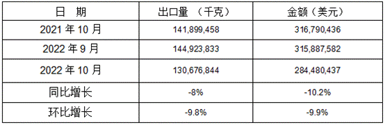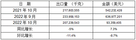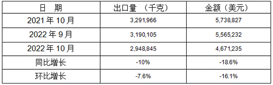 表 10:2022年10月同比、環(huán)比出口情況