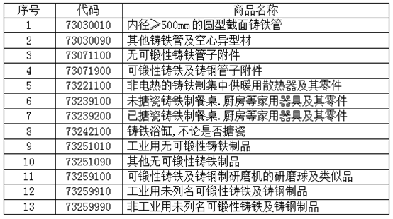 表 1:13個(gè)稅則號(hào)黑色鑄件